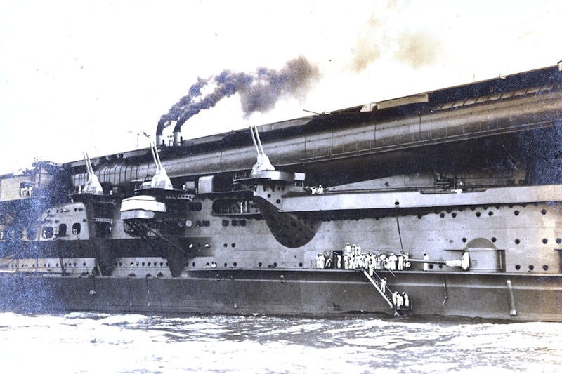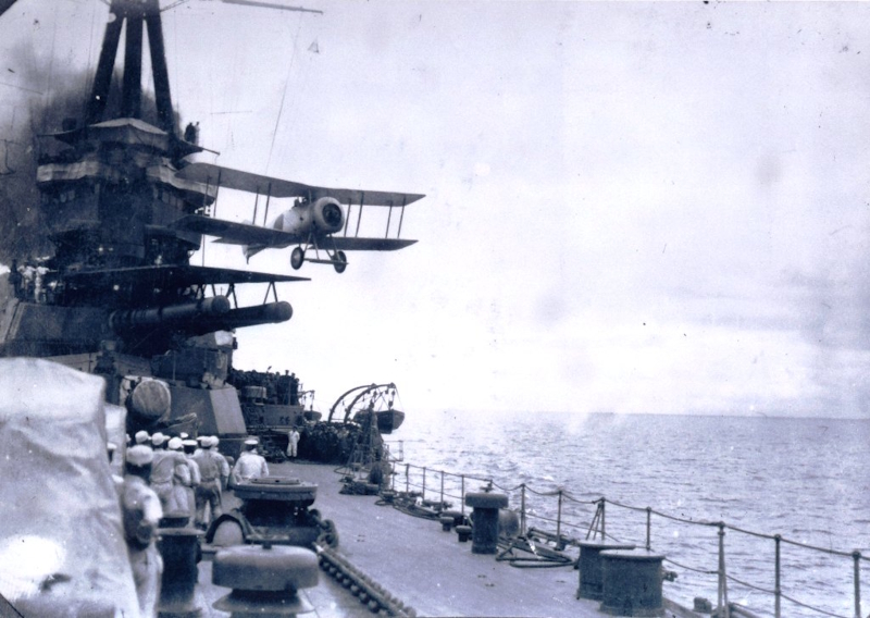 ちょっと戻って、中段甲板のこと。赤城の解説では艦橋でごまかしているが、発艦に使うつもりだったことは明らか。甲板長はとても短いもののそれで大丈夫と考えたことの証拠として、砲塔の上から発進テストをしている写真も載せておく。これは飛行機資料として購入したものだが、中段飛行甲板の短さと頭のなかで結びついておらず、前述のおしゃべりの際に言及があり気づかされた。