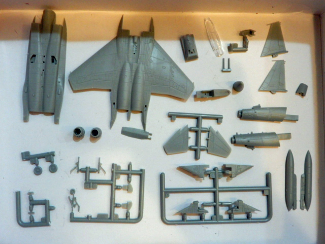 トミーテックのキットで,初版は,2009年。技MIX(ギミックス)シリーズとして,彩色済みの部品にデカールが付属したものが次々にリリースされました。今回使用したのは,彩色が施されていない部品がセットされた”無彩色キット”です。武装や燃料タンクが付属し,キャノピーの開閉や降着装置の上げ下げ,ジェット吸気口の上げ下げを選択できる部品が揃っています。一見,スナップフィットキットに見えますが,組み立てには,接着剤が必要です。オプションとして発光ユニットやフライトユニットが発売されていました。