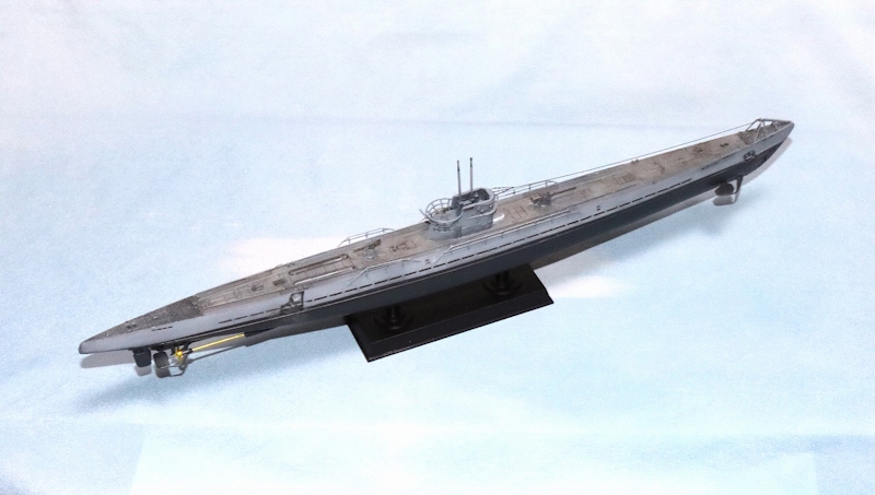 箱絵あるいは組立説明書の塗装指示には、喫水線より下が赤く塗られていますが、大戦中のUボートは、船体上下がグレー濃淡2色の塗り分けで、ブーツライン(喫水線部分の帯状部分)の塗装はされていなかったということのようです。