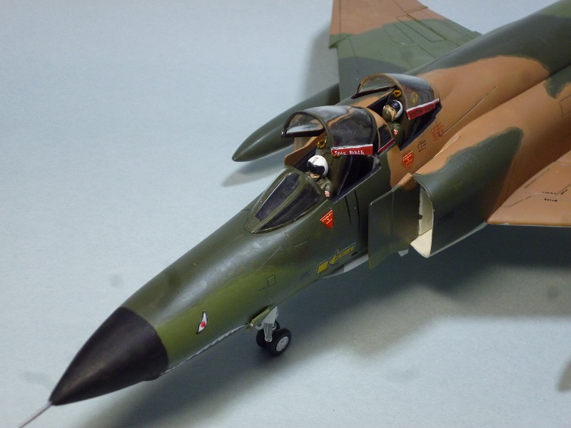デカールはうまくスライドするものもあったが、割れたのをつないだりちぎれた箇所を筆塗りで補ったりした。機首のシャークマウスは手描きしてある。発売当初から機首が細く、さらに幾分長いと言われているが、特に手直しはしなかった。出来あがってみるとベトナム迷彩のおかげもあって、実戦で活躍した高性能戦闘爆撃機の雰囲気がよく出ていると思う。