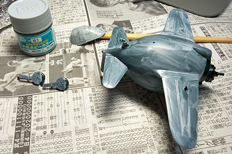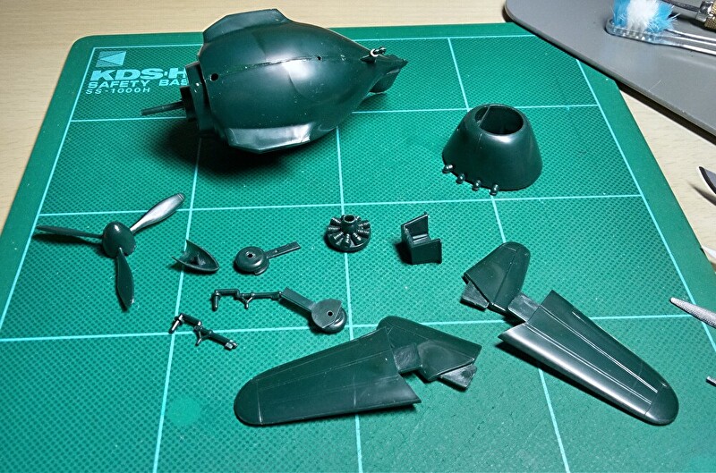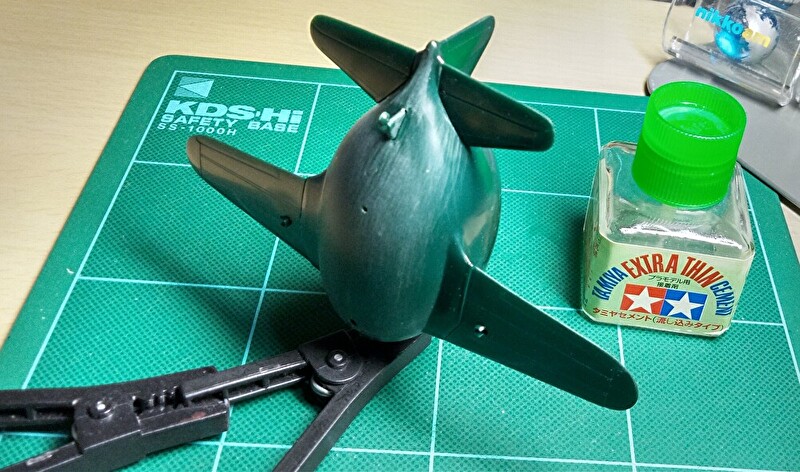 本機は"卵"なので、不要な凹凸はご法度。胴体の合わせ目は、金ヤスリで適当にならしておきます。