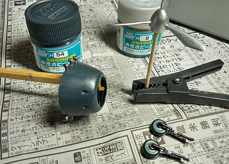 プロペラをシルバー。エンジンカウルをネイビーブルー。排気管は焼鉄色。