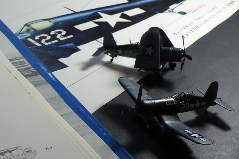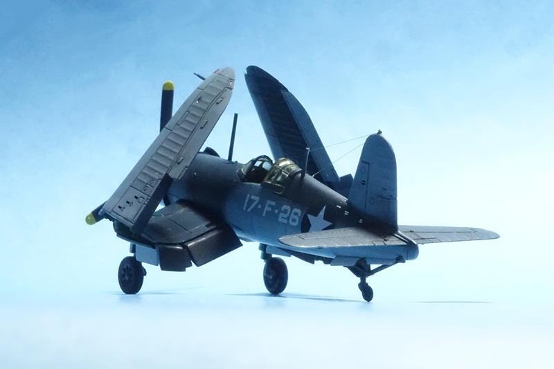 ところが、かかる<AFVクラブ>のキットもいざ実際に組み立ててみると、こんなヤワな素材にはとうてい刻印不能とも思えるような細緻なモールドと的確な造型に圧倒されながら、いつの間にか、大柄な逆ガル翼の特徴を余すところなく表現したF4Uが完成してしまいます。さらにこのキットはワンセット2機入りで、折り畳み主翼・動翼・カウルフラップなどが高い精度の開閉パーツでオプション展開されているため、各部に複雑な機構をもつ本機を様々な動きのある状態で組み上げることのできる楽しさは格別です。