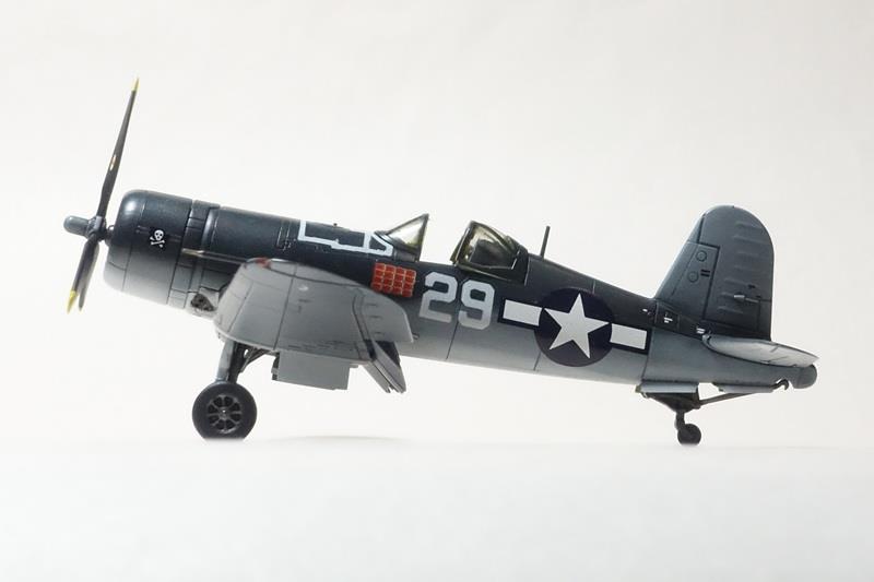 こちらはマルコム・フードに進化したF4U-1Aで、1944年2月のブーゲンビル島におけるVF-17「ジョリー・ロジャース」の所属機。レベル1/32キットの迫力ある箱絵が記憶に残るアイラ・C・ケプフォード中尉の搭乗機ですが、このように本機を真横から眺めると、コックピット先端が主翼後縁まで後退している本機の特異なシルエットにはあらためて驚かされます。