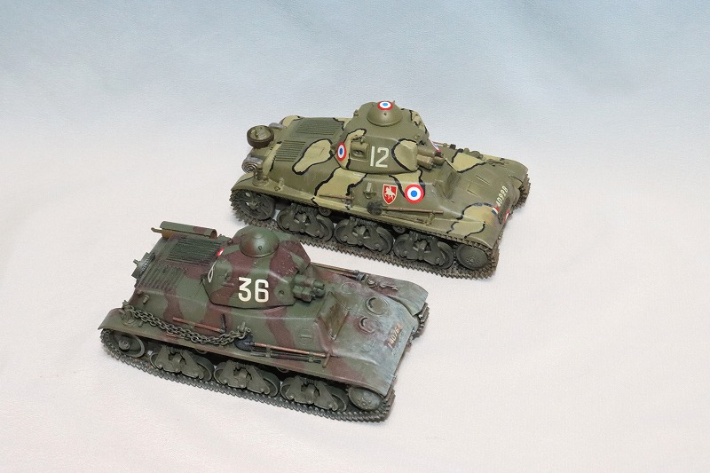 自由フランス軍のロレーヌ十字は、白い棒状のデカールを使い、十字の各先端を丸くホワイトで塗っています。実際は、トランプの「クラブ」の上の部分のように3つの円になっているのですが、そこまではやりませんでした。フランス国旗のデカールは適当なものが見つからず、たまたま手近なところにあったHi-decal line のMiG-21 bisのデカールの中のクロアチア軍機の垂直尾翼に貼る横長のクロアチアの国章マークが、よさそうなサイズだったので、適当にカットして貼ってみました。また、前面の白いスター&リングは、やはりタミヤの1/48のトラックキットのもの。実際はリングの幅がもう少し細いのですが、加工は困難なのでそのままとしました。