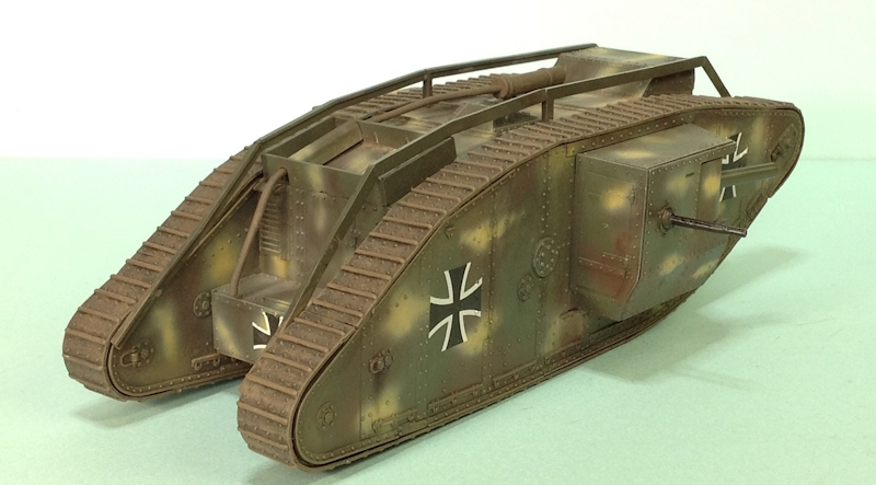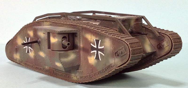 別項で取り上げた「マーク4 タッドポール」が単色塗装なので、こちらには迷彩塗装を施すことにしました。先に生産された系列車輌である「マーク1」に迷彩塗装がされており、同様にするつもりでしたが、マーク4は単色塗装が標準だったみたいです。そこで、敵方のドイツ軍が鹵獲して迷彩塗装した仕様を再現しました。迷彩色は諸説ありますが今回はグレーグリーン、レッドブラウン、ミドルストーンの三色で塗装しました。迷彩塗装に使用した塗料はMr.カラーとガイアカラーです。迷彩パターンが所々で違いますが、WW1のドイツ軍戦車の迷彩塗装を再現するのは今回が初めてだったので、この機会に習作を兼ねていくつかのパターンの再現を試みた次第です。模型だからこそできる表現とご理解いただければ幸いです。