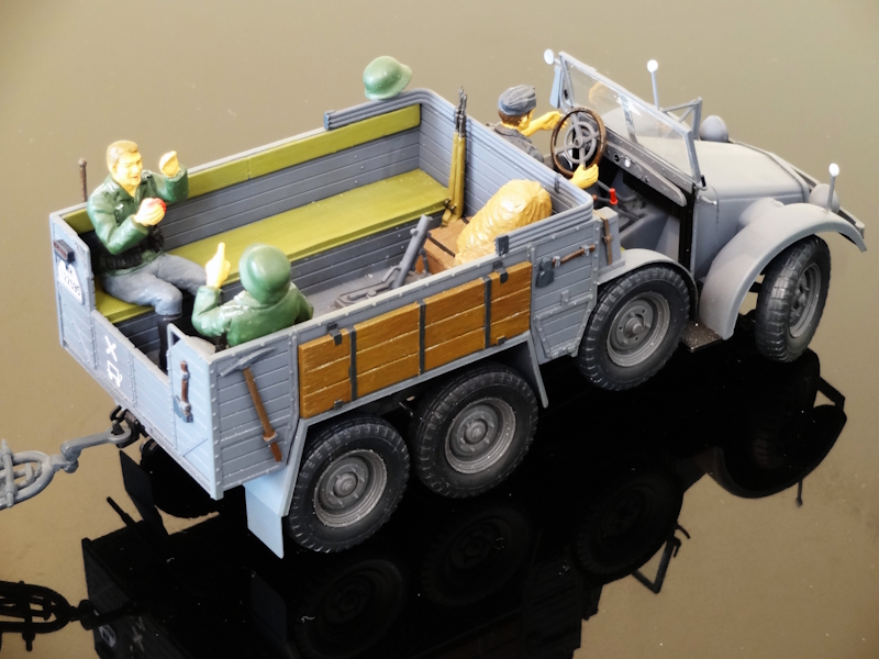 タミヤのプロッツェのキットには、プロッツェ単体のもの(Kfz.70)と 3.7cmPakを牽引しているもの(Kfz.69) の2種類あります。小生のものは(Kfz.70)のほうで荷台の付属品などに違いがあるようです。前線ではKfz.70も牽引に使われたのでは、という想像が今回の組み合わせです。