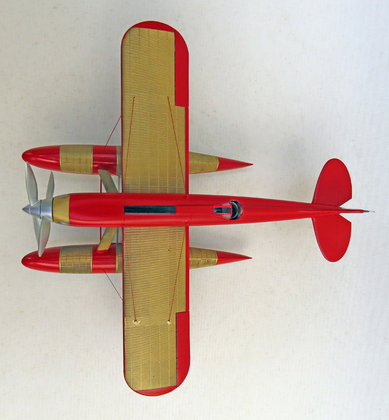 支柱が固定された後、上下逆さまにした機体にフロートを乗せて接着、固定するというサーカスのような方法で何とかジョイントしました。