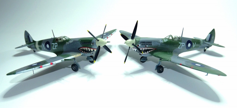 エデュアルドの「オージー・エイト」コンボキットには、シャークマウスの機体が4機6種取り上げられています。第457スコードロンの上部組織である第80ウイング(452「QY」、457「ZP」、79「UP」各スコードロン)のボビー・ギブズ(Robert Henry Maxwell Gibbes)中佐のRG◎V(A58-602)とブルース・ワトソン少佐(スコードロン・リーダー)のZP◎W(A58-606)がシャークマウスの大小2種ずつ、ZP◎F(A58-609)がシャークマウス小、ZP◎V(A58-631)はシャークマウス大となっています。