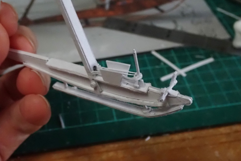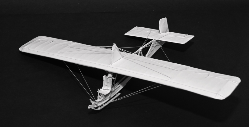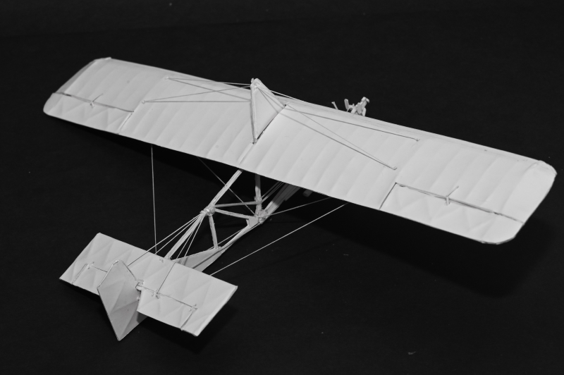 実機の主翼と胴体間には支柱は無く張線によって形が保たれますが、模型でも糸を張ると頑丈になります。