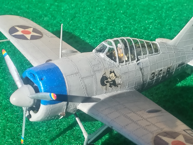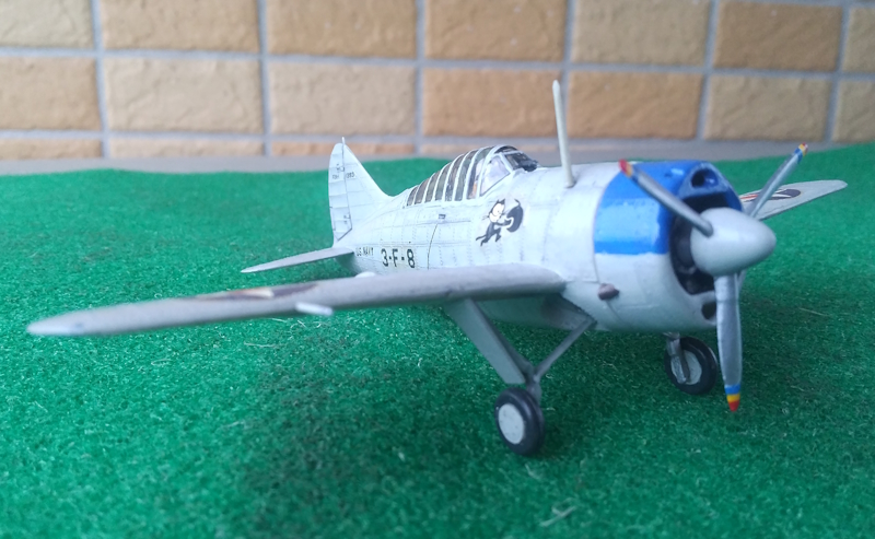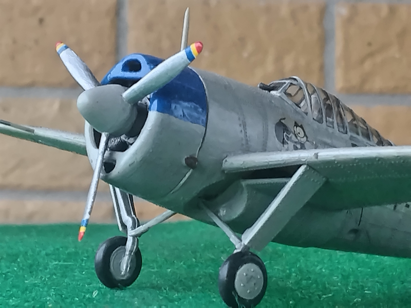 ここで全体塗装に入ります。一応説明書通りに全面をライトガルグレーで筆塗りしました。モールド色がライトグレーでしたので2回塗りでOKでした。カウリング上面はスージーブルーで塗りました。動翼部分を中心にブラックで墨入れをしました。デカールは少し黄ばんでおり使用できるかわかりませんでしたが、フィルムリキッドを塗って使用しましたが、国籍マークとフェリックスはなんとか貼れました。あとは台紙から剥がれなかったり、ちぎれたりしたので手持ちのデカールとタッチアップでなんとかでっちあげました。