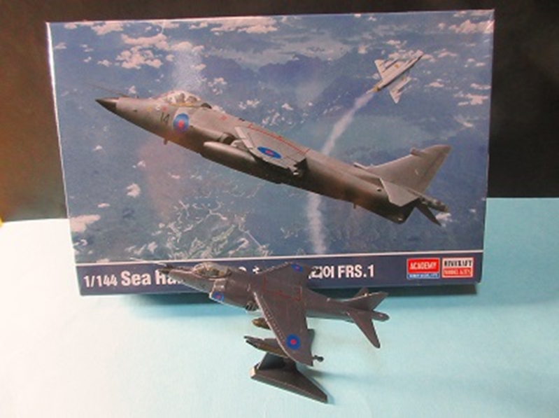 第二次大戦機好みなので、英国製ジェット機のプラモの入手は殆ど無く、エアフィックス1/72のグロスター・ミーティアは持っていた筈なので、探したのですが出て来ず、途方に暮れていました。そんな時にプラモデル屋さんでアカデミー1/144のシーハリアーを見つけ、安価な事と144好きもあり、即ゲットして、即日と言いたい所ですが、2日間で作りました。