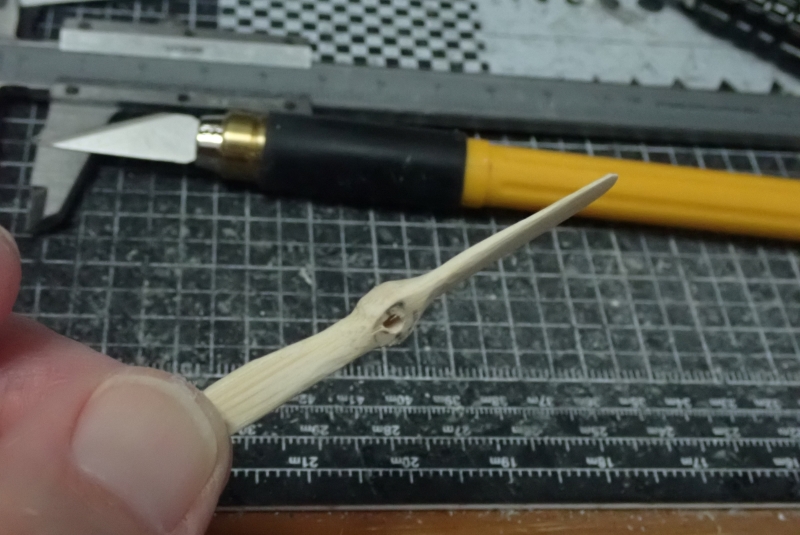 プロペラは竹串を削って表面に薄いコピー用紙を上張りしています。紙を積層して削るよりシャープに仕上がりますし、紙より重くなるので回転が滑らかになります。