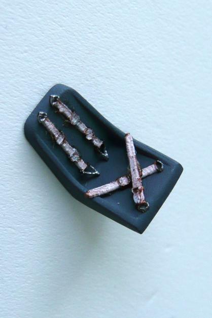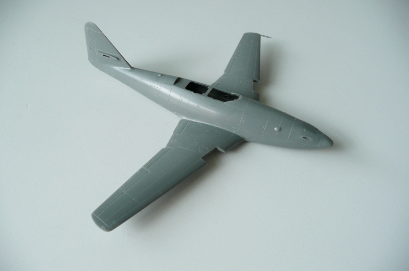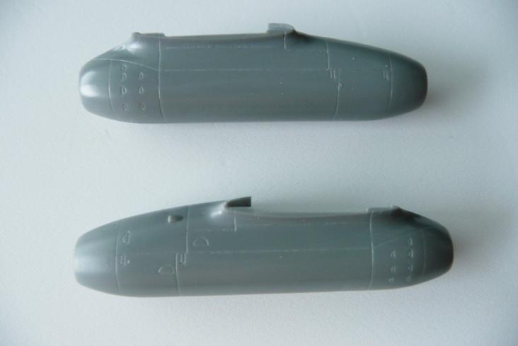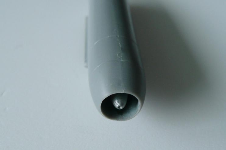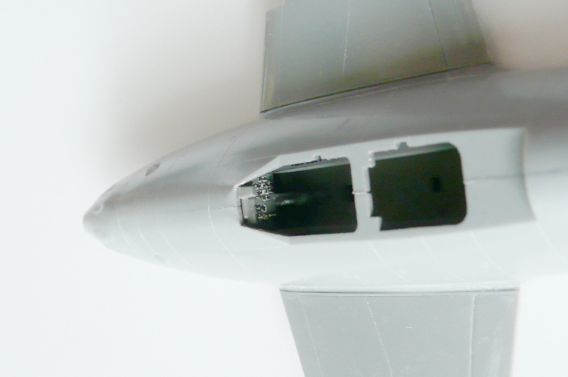 まず胴体左右パーツのコクピット部分をニュートラルグレイで塗装しました。次にコクピット部と前脚収納部を組み込みす。そして機首上部の砲口部を取り付けますが、戦闘爆撃型では砲口が2門のパーツを取り付けます。この際、機首部に3g程の鉛の錘を取り付けました。Me262はお尻が重いので錘を忘れると尻もち必至です。砲口部のパーツと胴体との間には少し段差が生じるため、擦り合わせしました。