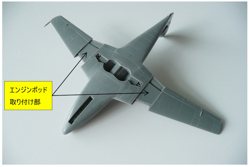 左右のエンジンポッドは(写真4)に示した主翼下面部に取り付けます。ここまで組み上げ次は塗装です。