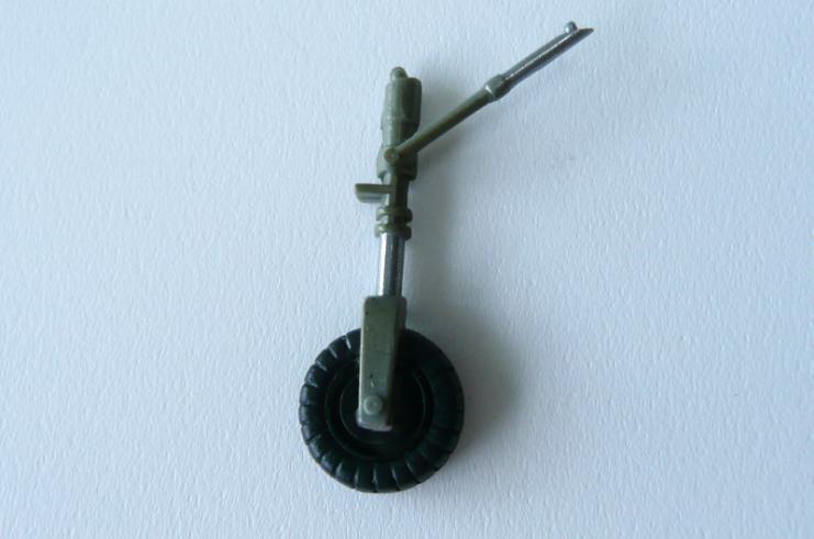 その後、脚やアンテナなどの部品も塗装しています。一例ですが、前脚は一体成型ですが、(写真9)のように脚とアクチュエータの摺動部はクロームシルバー、脚は収口と同じRLMグレー02、車輪のホイール部はつや消しの黒、タイヤはタイヤブラックと塗り分けました。