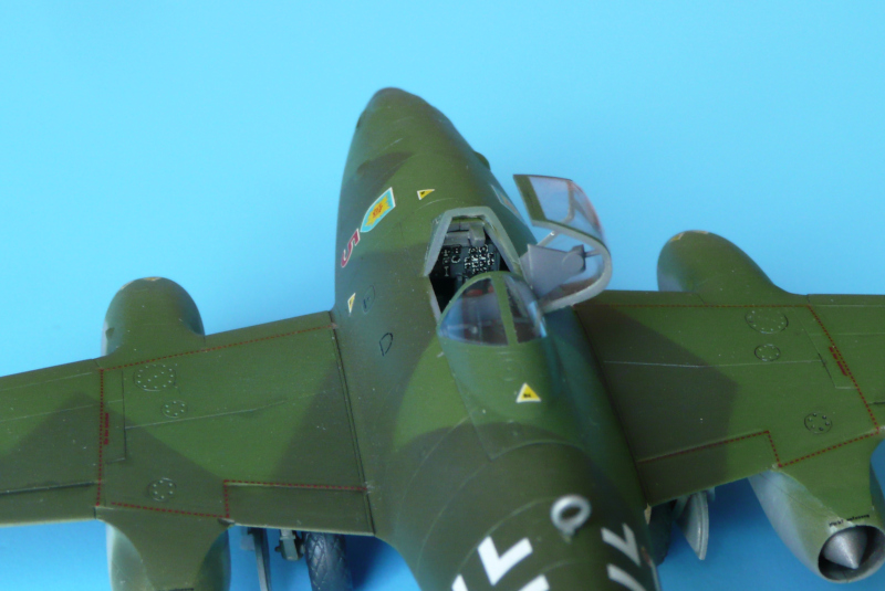 デカールを貼り終えた機体のパネルラインに墨入れをし、下面には少し汚しを加えました。その後水平尾翼や脚類、脚カバー、アンテナなどを機体に接着し、500㎏爆弾2発を機首下面のパイロンに取り付けました。そしてキャノピーとウィンドシールドを仮止めし、保護のための艶消しクリアーを機体全面にオーバーコートしました。乾燥後ウィンドシールドとキャノピーのマスキングシートを外し、機体に取り付けました。キャノピーは開状態としています。(写真11~16)が完成したMe262-2aです。(写真17)が後方からコクピットを見た状態です。また(写真18が機体の下面です。