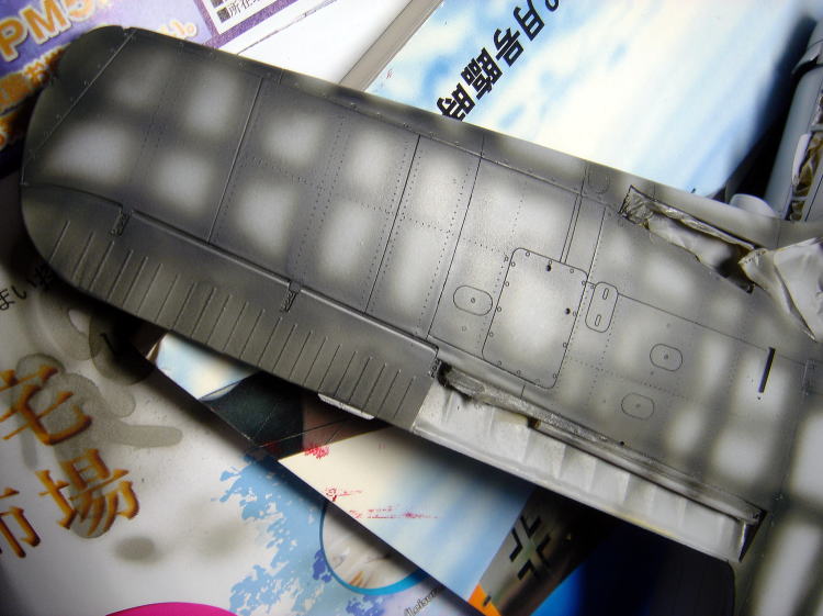 斑点が大きくなりすぎた場合はあわてず、後で 下地のライトグレーをからませるように吹いて修正します。結果的にいい按配になればいいので、気楽にやってみましょう。