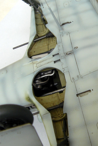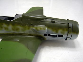 3日くらいしっかり乾燥させた後、油彩のローアンバーを薄くしてスミイレをしておきましょう。エルロンなどの可動部には濃い目で流します。 |