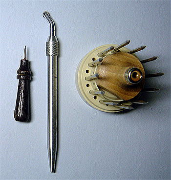 具体的には、エア圧を絞って、ごく小さい斑点を 5つか6つ吹いて、一つの斑点にします。すると、大きさや形を自由にコントロールできます。