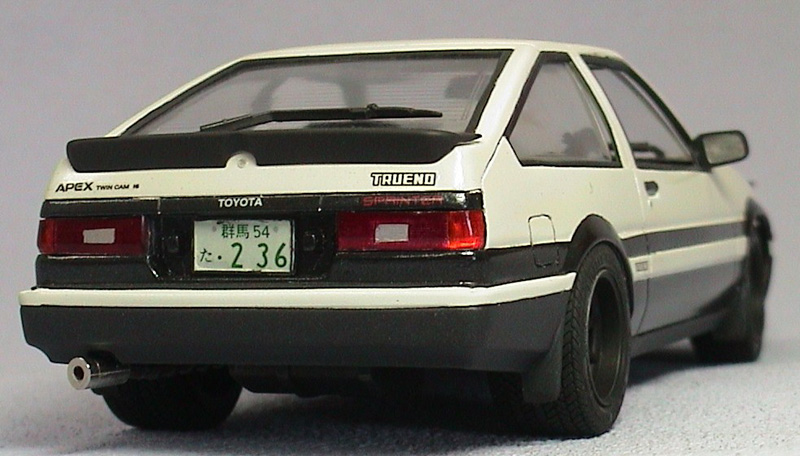 最初にボディのヒケ、表面処理を行い、サフェイサー白で下地を作りました。 次に#1500でペーパーがけを行い、中性洗剤で洗いました。次に白色でボディを塗りました。次に黒の部分を塗るのに、マスキングをして気を使いながら塗装しました。塗装が乾いた後に#2000でペーパーがけを行いました。次にデカールを貼り、クリヤーを塗装しました。