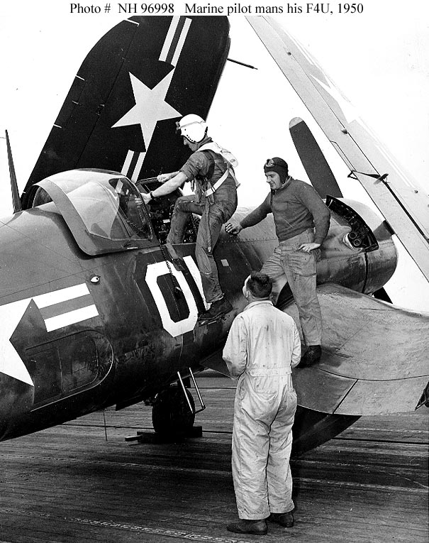 CV-45 “USS Valley Forge"艦上でMAW-1 HEDRON-1のF4U-5Pに乗り込むパイロット。