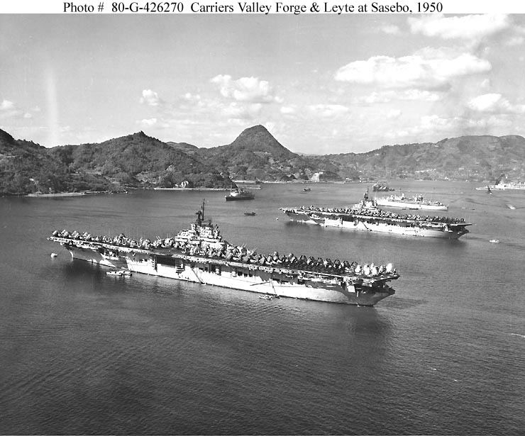 6月にはサンディエゴへ帰港予定であるCV-21”USS Boxer"と交替するのが、CV-45 “USS Valley Forge"とCVG-5であった。そして1950年5月1日、出港の準備を整えたヴァリー・フォージは、別れを惜しむ見送りの家族を残し、サンディエゴの港を離れていく。広大なNAS North Islandを左手に見ながらゆっくりと太平洋に出ると、艦載機の収納が始まる。静かな飛行甲板は一変し、次々と着艦してくる機体の収納に追われた。艦載機の収納が終わると、再び静寂が戻り、ヴァリー・フォージはゆっくりと西方に舵をきった。