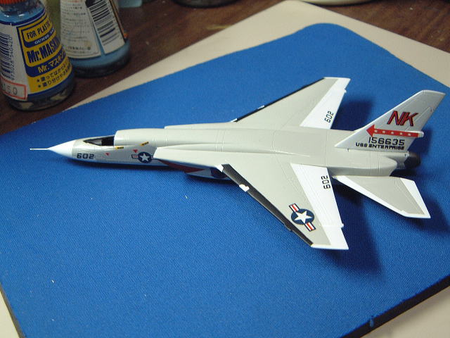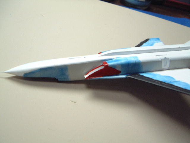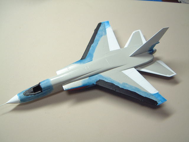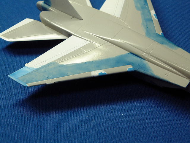 今回は塗装の手順を中心に紹介します。まず、全面を上面のガルグレーで塗装してしまいます。このガルグレーは下塗りを兼ねているわけです。舵面、下面を除き、マスキングゾルでマスクしてしまい、その後、ホワイトで塗るのが一番簡単です。