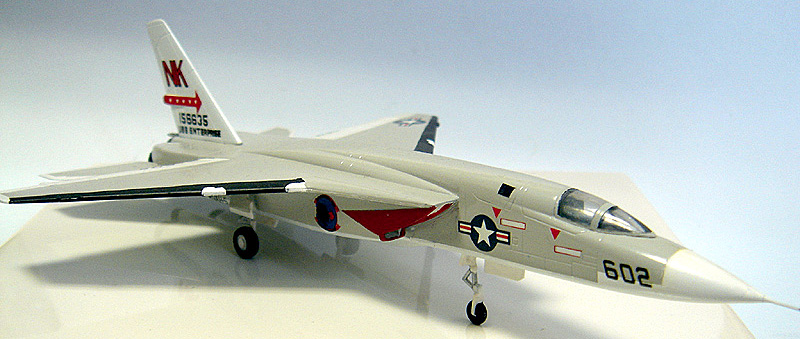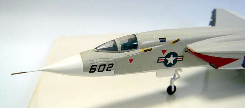 胴体内部をダークグレーになり、オモリを機首に仕込んで胴体左右を接着し、主翼、尾翼をつければ、1/144は すぐ形にすることができます。手を加えた方がいいのは機首のピトー管くらいで、シンチュウパイプと洋白線を組みあわせて、瞬間接着剤でつけて、根元の形状を丁寧にパテで整形しておきます。