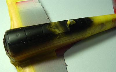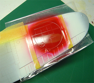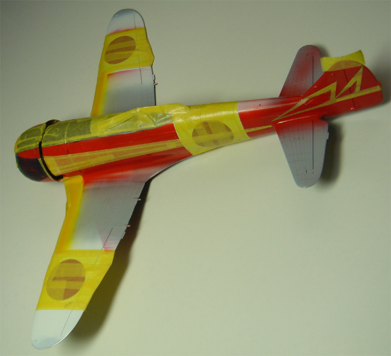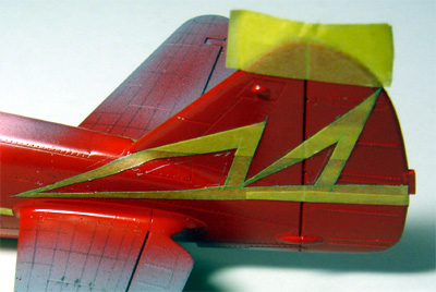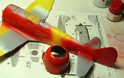 3)黄色部分をマスキングして 胴体と尾翼の赤(No.68モンザレッド)を塗装します。