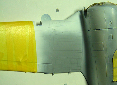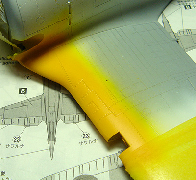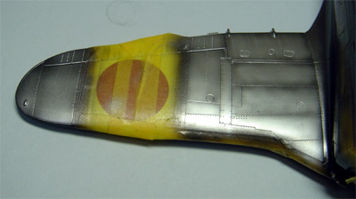 (4)そのマスキングテープを尾翼に貼り付けます。