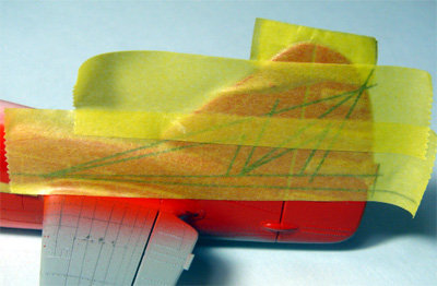 (5)今回は大きなマークなので、機体の上でマスキングテープにナイフを入れて、切り取っています。尾翼先端の赤は別にテープでマスキング。