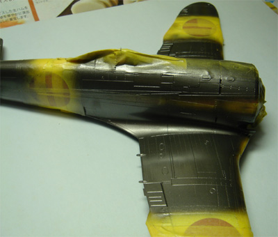 胴体の赤帯は 細切りしたマスキングテープを使って、マスキングしてゆきます。