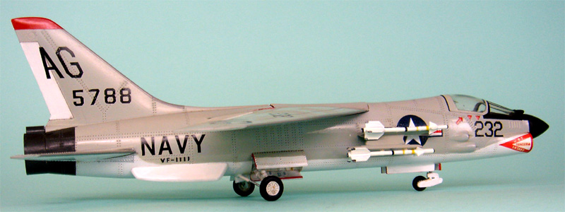 1952年秋の超音速艦上戦闘機の提案要求に対し、承認されたチャンスボート社の案がクルーセイダーの原型となったXF8U-1です。原型1号機は1955年初飛行し、音速の壁を初飛行で突破する偉業をなしとげております。基礎設計が良かったのか開発は極めて順調に進み、2年後の1957年には量産型F8U-1を装備する飛行隊VF-32が実戦配備に着いています。