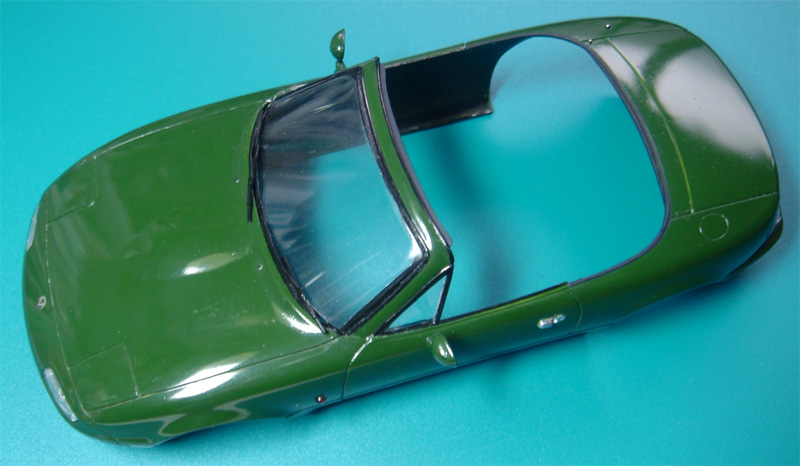 ボディの塗装は 、ロータスグリーン風。MrカラーNo.6グリーンをそのまま吹いています。グリーンは厚く塗るほど色が濃くなってゆきますので、好みの色合いで止めましょう。 塗装後に、実車のコンパウンドワックスでツヤだしと保護を兼ねて磨いています。