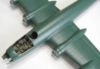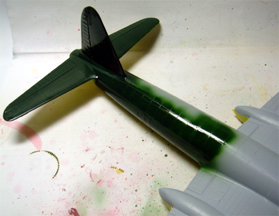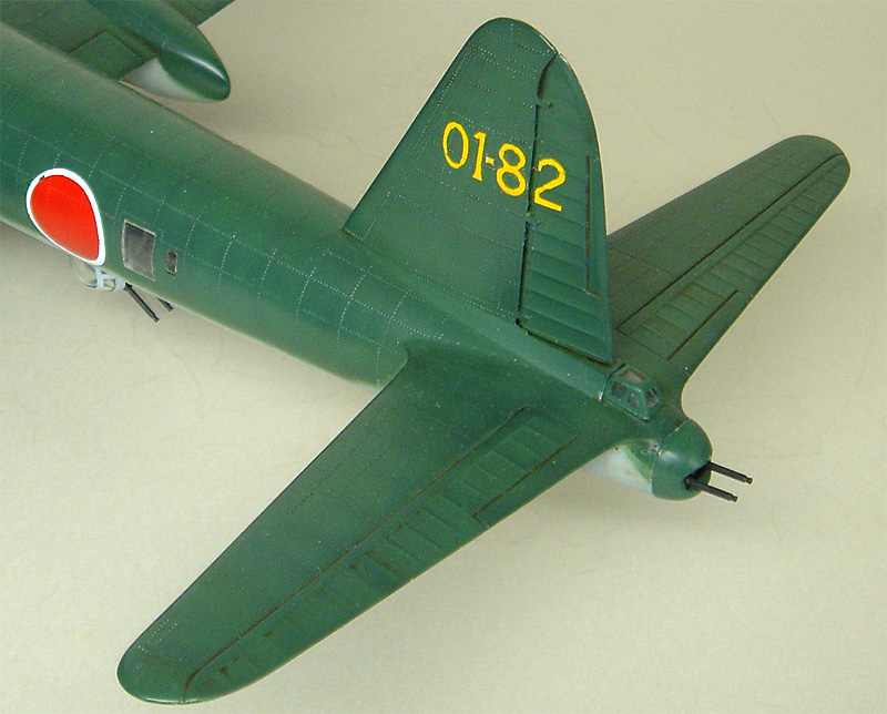 アンテナ支柱とアンテナ線は資料を調査中で、まだ取り付けておらず、静岡HS合同展の時も未装備のままとなってしまいました。 電探は、試作機にはもちろん取り付けられていませんでしたが、実戦配備になる際には一式陸攻のように側面と機首風防下に装備されたのではないかと予測でき、追加装備しても面白いかもしれません。 |