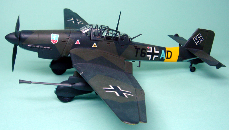 戦車攻撃機G-2型は主翼下面に37mmFlak 18機関砲のポッドを2門搭載した対戦車攻撃タイプで 地上の敵戦車に空から猛鳥のように襲いかかりました。 中でも有名なのは、東部戦線で戦車キラーとして名をはせたハンス・ウルリッヒ・ルーデルの乗機で、モノグラムのデカールの設定にもなっています。 |